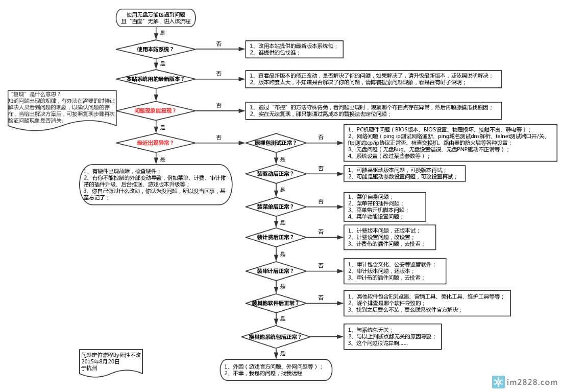 而上面的分步定位法,就是把这个表格流程化了而已,楚河汉界以下,其实就是流程的开始……因为我是系统包的作者,所以我最关心的问题是,问题是否因我的系统引发,如果问题是因我系统而起,那么我有责任进一步去处理解决;如果问题并非我系统引发的问题,则属于帮忙范畴。