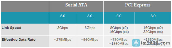 然而落后的SATA3接口理论上限只有6Gbps,实际很难突破800M/S,这个速度并不能满足需求,目前市场上的SDD很多都已经有550MB的存取速度,优秀者甚至已经突破SATA3的上限