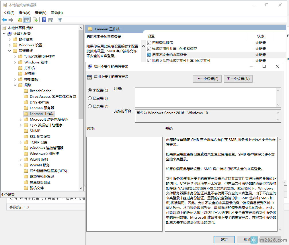 组策略编辑器依次展开:计算机配置–>管理模板–>网络–>Lanman工作站
