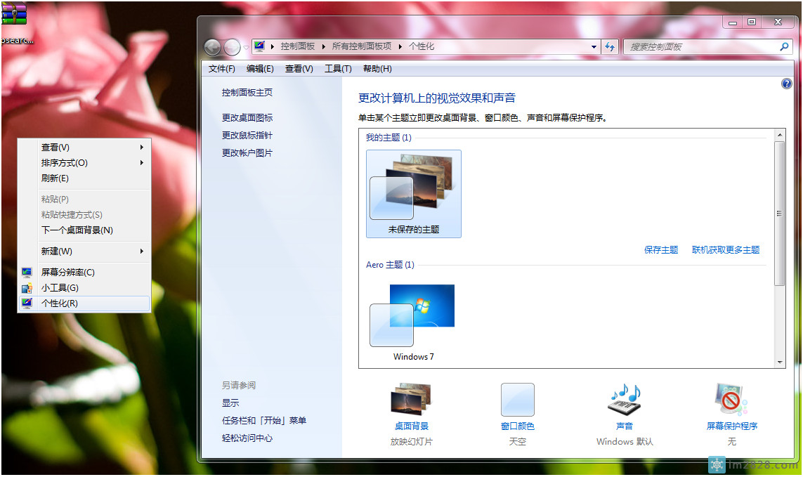 在桌面右击选择个性化,进入后选择一个aero主题,如下图