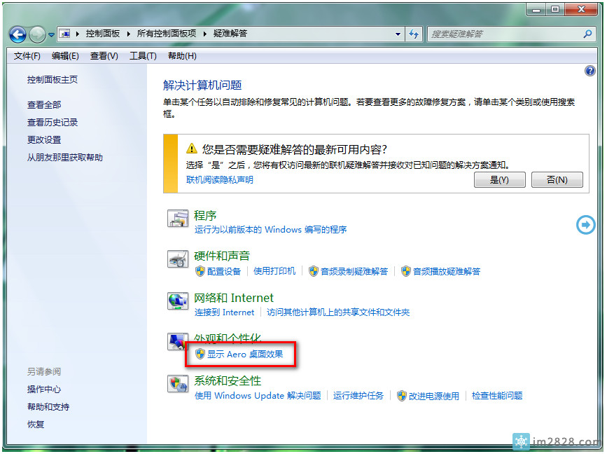 选择“在 Windows 上启用或禁用透明玻璃效果”开启透明效果就行了,如果这里搜索aero没有出现“在 Windows 上启用或禁用透明玻璃效果”就点击下面的“查找并修复透明和其他视觉效果存在的问题”,本人就是属性这种情况,网上也多数说开启这里的透明功能就行了。但是当时我搜索后没有看到有“在 Windows 上启用或禁用透明玻璃效果”的项,通过自己折腾解决了问题,回想应该是之前用360优化禁用了系统的aero透明效果.