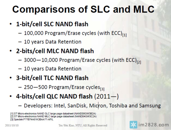 SLC和MLC相信都比较熟悉,这里不做过多介绍,重点讨论逐渐应用在SSD上的TLC闪存和新生的QLC闪存。