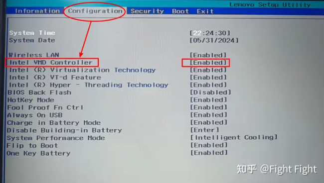 如果你的 BIOS 语言是中文,中文的 VMD 叫做 “Intel卷管理设备” ,你关闭(Disabled)它。