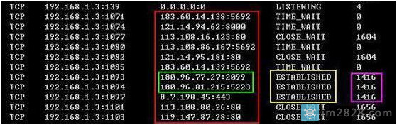紫框是LOL的客户端进程PID,黄框表示己连接成功绿框部分为服务器的IP和端口号。