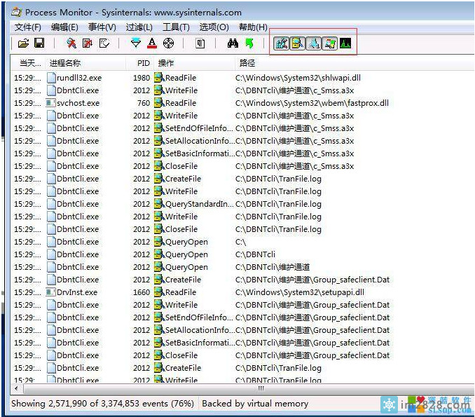 2,设置程序右上四个监视都打开,分别是注册表,文件,网络,进程线程。程序启动后就会监视系统绝大部份操作了。简单说一下,操作中 readfile 表示读取文件,WriteFile表示写入文件。