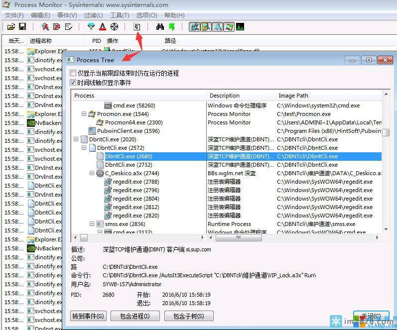 点击工具栏如下图标,可以查看进程树,可以很清楚看到历史上哪些进程属于哪个父进程。注意这里是历史记录也就是他消失了也能看到。所以还是有很有用。这里显示 我们的dbntcli.exe启动了自身并启动c_deskico.aex来处理桌面图标摆放,并导入了一些用户的注册表。还启动了 smss.exe 这个深蓝防逃费程序。