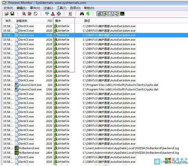3,这里可以看我们的程序 DBNTclie.exe 给ser200这台机子的 tcp端口 21983发送了消息,并接收了消息。tcp send(TCP发送) , TCP Receive (TCP接收),并写入文件(Writefile) kdsm.exe 这个文件(从服务器ser200下载的)