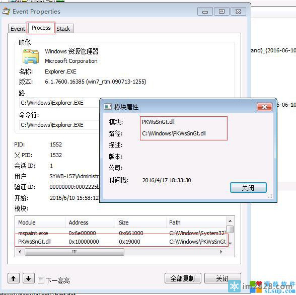 7,找到资源管理,双击process tab,有一个不明的dll注入 PKWSSNGT.dll