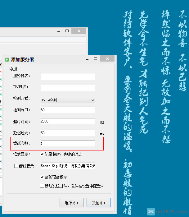根据用户反馈,对外网检测的需求,增加单个服务器断线重试次数的配置,只有超过指定次数的断线,才能认为是断线,才会进行后续的报警,邮件等设置。