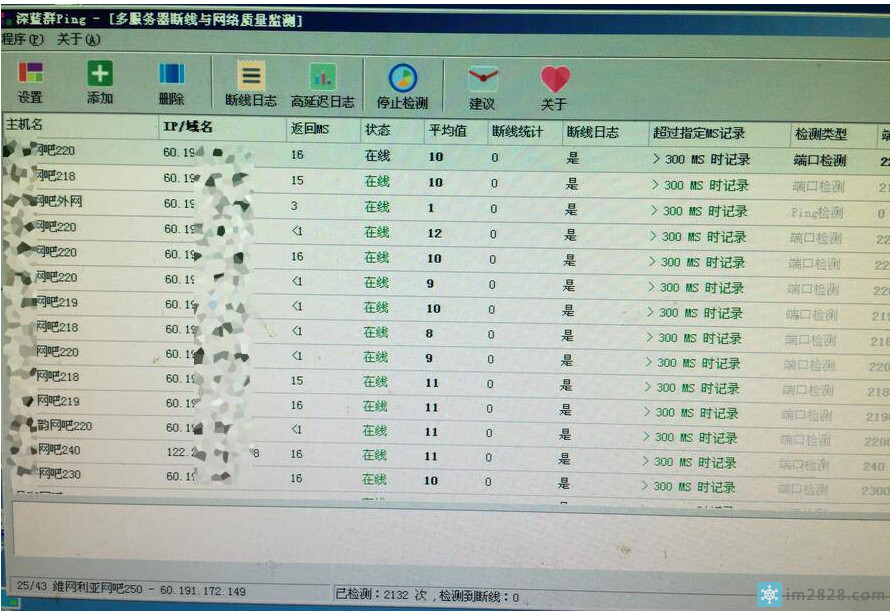 有时候技术不在网吧,网管也说不清哪里有问题,你配置好让他打开此程序,马上告诉你哪里断线。或者针对某台容易出故障的服务器单独进行日志记录监视。也可以在外网批量监视你所有网吧的PING或者是某个服务器端口是否打开。