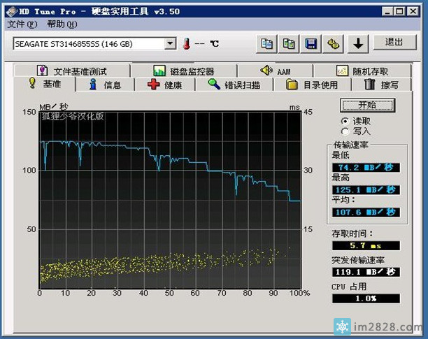 使用的是希捷146G的15000转sas硬盘,在全顺序读取的情况下,最高速度为125M.这个速度和普通的希捷11代盘差不了多少.