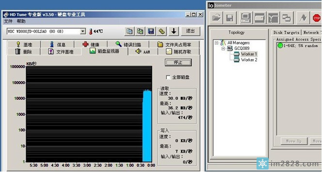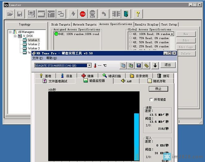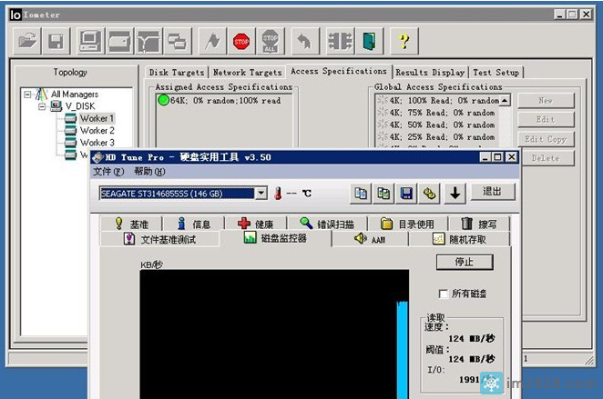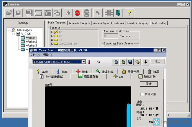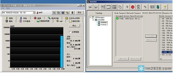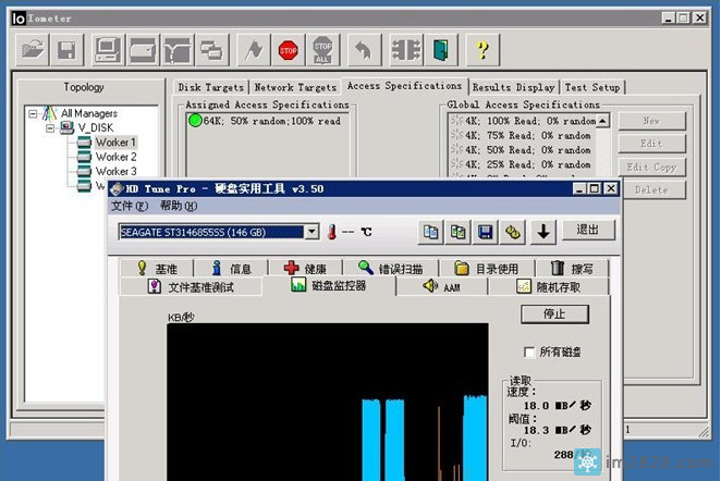 我们使用IOMETER来进行这项测试.IOMETER是专业的磁盘测试工具,因为可以灵活的设定测试的详细条件,因此在很多专业评测中采用.大家有兴趣的话也可以研究研究.
