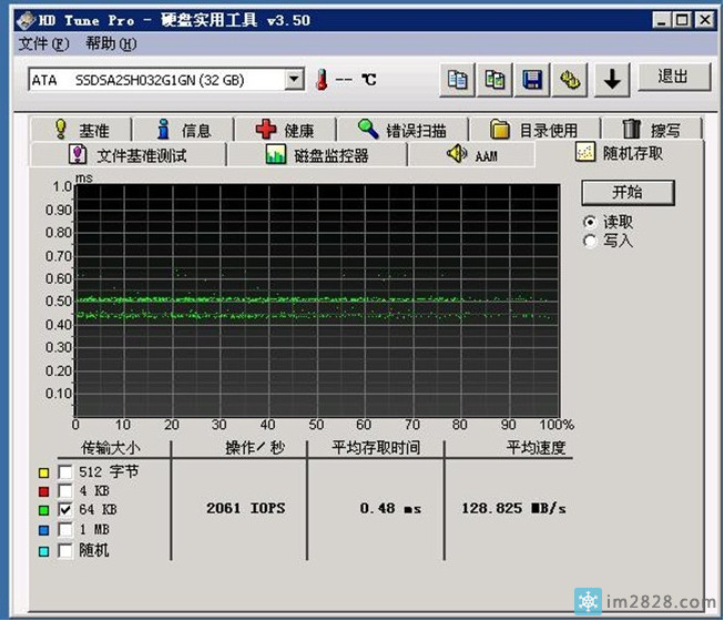同样的测试条件,金士顿的固态硬盘的随机读取的速度达到了惊人的128MB/S!平均读取时间为0.48MS,IO达到2061,这个性能是sata硬盘的30多倍,也是sas硬盘的10多倍.