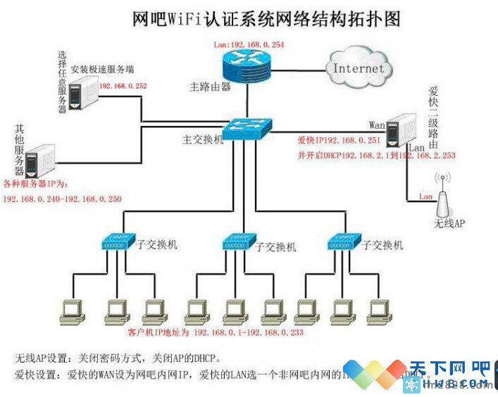 前言:安装爱快在这里就不说了官方网站有教程,以下按爱快安装到实体机为例进行说明,这里用爱快做二级路由来实现WIFI授权认证,让网吧顾客上机则可以使用WIFI,下机将自动断开WIFI。