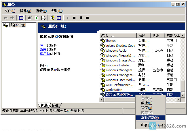 点击电脑屏幕左下角→开始→设置→控制面板→管理工具→服务→锐起无盘XP数据服务→鼠标右击→重新启动;