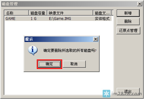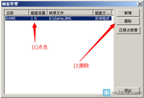 在“磁盘管理”窗口中点选需要增大容量的镜像包(例如 Game 容量 1G 的镜像包) 然后点击→删除;