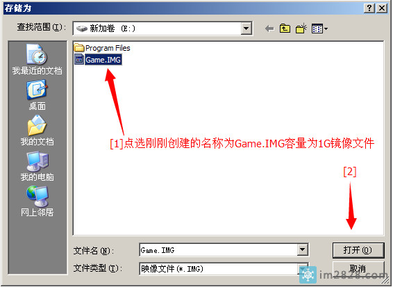 弹出“存储为”对话框,浏览并选择需要增大容量的镜像包文件(例如:名称为Game;容量为:1G 的镜像包,点击→打开;