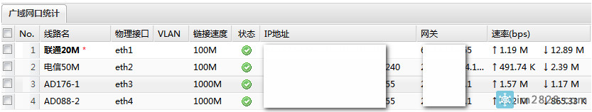如上图所示,联通光纤20M 电信光纤50M 还有2根 100M的 ADSL用来分流。