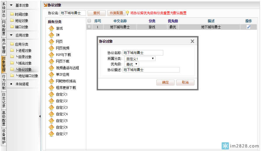 [对象管理] →[应用对象]→[协议对象]。选择 “地下城与勇士” 的协议,修改所属分类,为“自定义1”