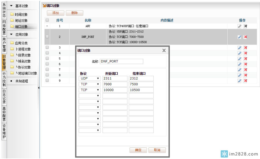 [对象管理] →[端口对象],添加端口对象,比如命名为“DNF_PORT”,并填入端口范围 UDP 2311-2312 TCP 7000-7500 TCP 10000-10500