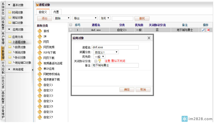 [对象管理] →[应用对象]→[进程对象]。添加要分流的进程名、备注,所属分类,比如选择为“自定义1”。比如添加 "地下城与勇士" 的核心进程 dnf.exe 。优先级选择 “最优” 。不勾选关闭协议分流