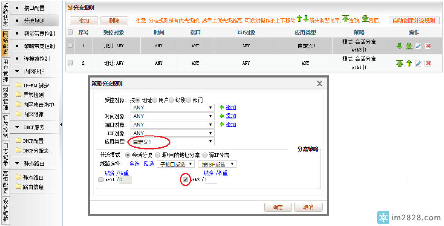 如下图所示,表示把 自定义1,走eth3 的线路出去