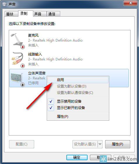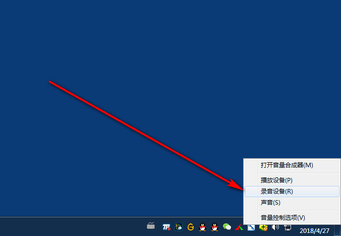 右键点击这个图标,我们会在弹出的子菜单中看到一个叫做录音设备的选项,点击进入