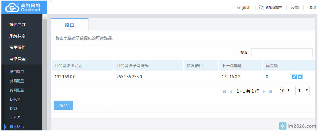 3、添加高恪路由 静态路由表 一般为网吧内网使用的网段(例如我们网吧电脑IP为192.168.0.1-192.168.0.100,文网卫士配制WAN口IP为172.16.0.2)