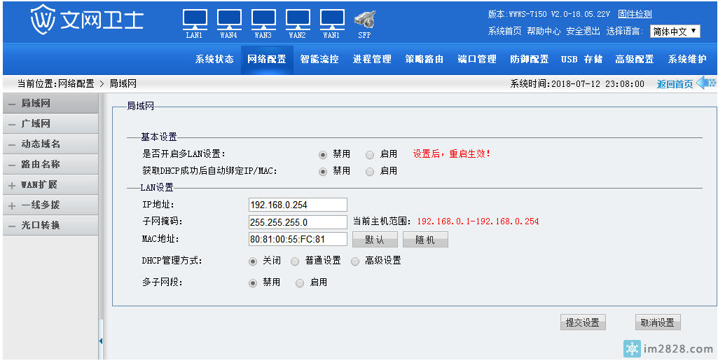 4、把文网卫士LAN口设置为网吧的网关192.168.0.254