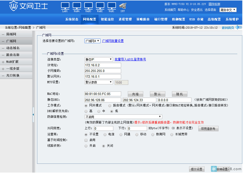 5、设置文网卫士WAN口外网为静态IP,调整为高恪路由LAN口用一个网段内的IP,