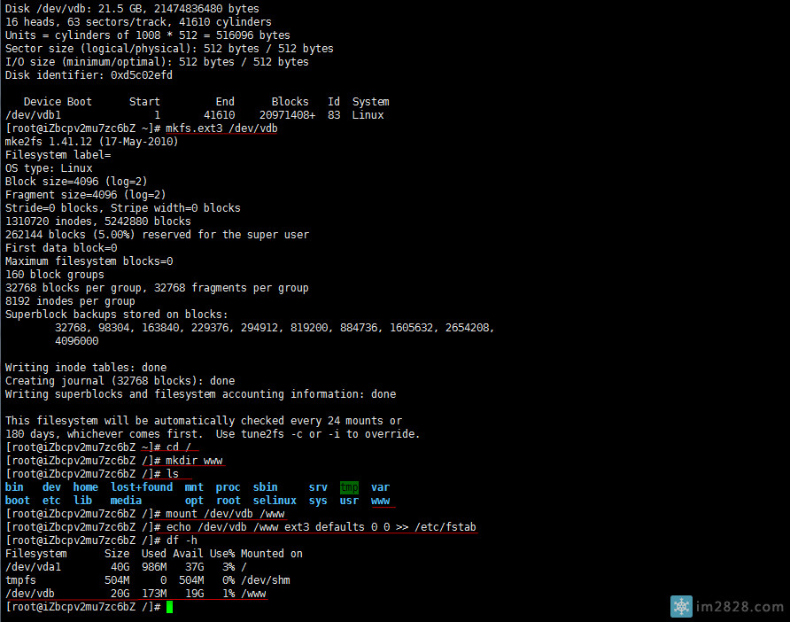 你会发现mount on下面已经显示/dev/vdb已经被挂载到/www目录下了。