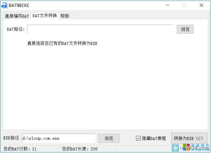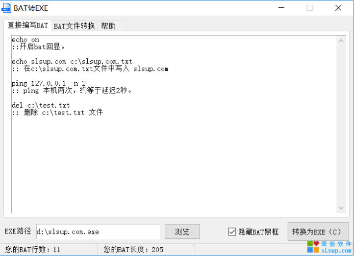 程序支持直接编写BAT转换为EXE以及将已有的BAT文件转成EXE。转换后的文件只有10-20KB(根据你BAT的大小)非常的小巧方便。