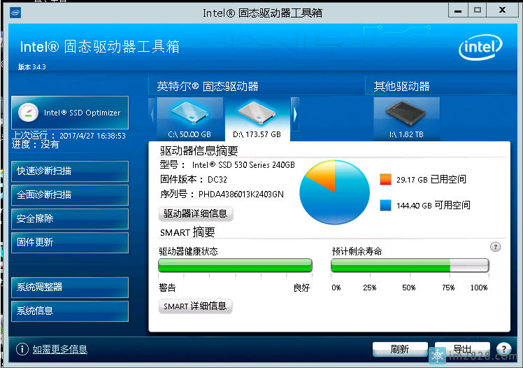 用intel ssd toolbox看,还有很多寿命,如上图。