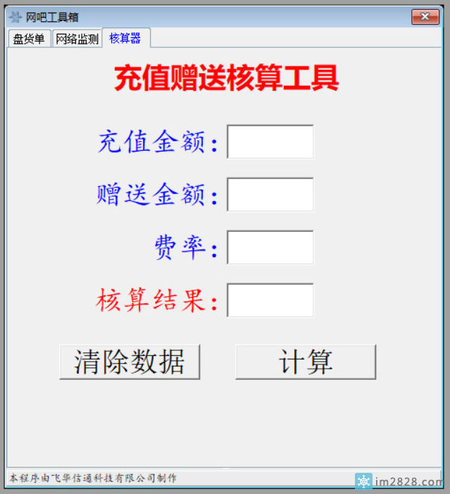 今天SVIP群讨论起有些朋友不会计算网吧赠送费用后的实际费率。该程序用于给网吧快速计算充值赠送的实际金额。如,充100赠送 70,收费标准为 3.5元,那么实际费率是 100/((100+70)/3.5).该程序除此外,还有一些其它的计算。