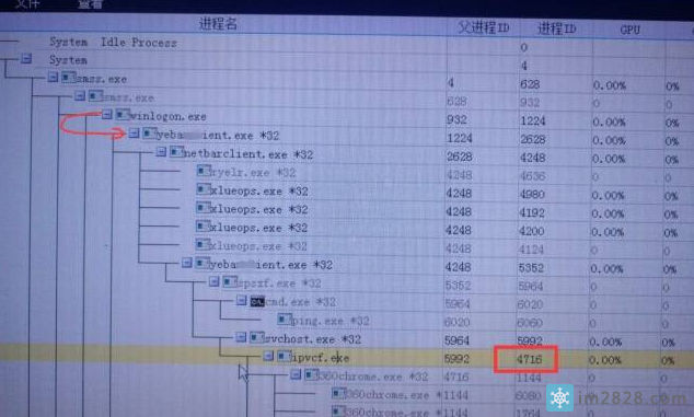 我们按下“Ctrl+F”来搜索进程ID4716。在图四中,我们可以清晰的看到进程ID为4716的这个进程的所有父进程关系,很明显这个进程是由一个叫“svchost.exe *32”的进程创建的,而他们最开始都是由一个叫“yeba**lient.exe”的进程启动的,为防止不必要的麻烦,图中进程名称已打码。