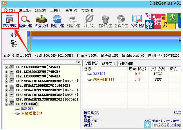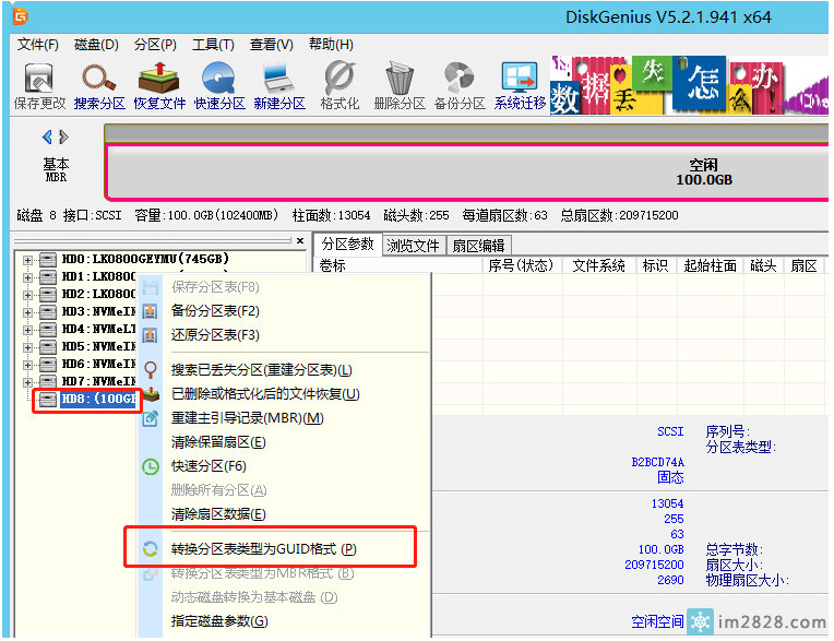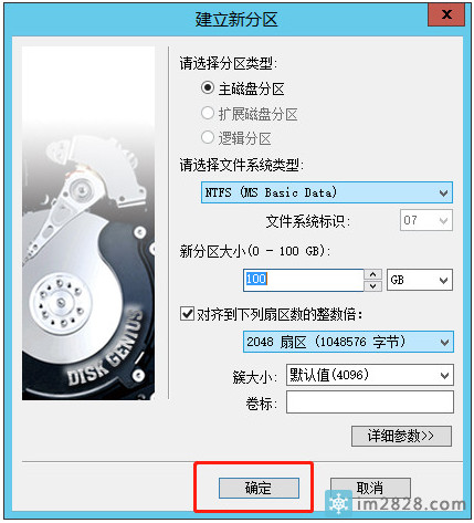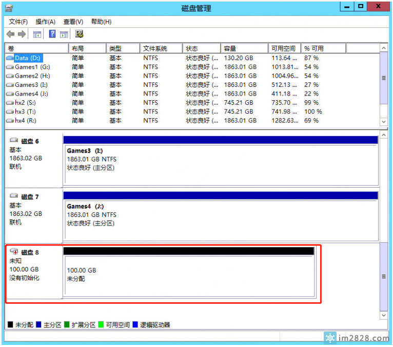 挂盘出现上图提示点击确定后出现下图,我们看到100G未初始化的磁盘。