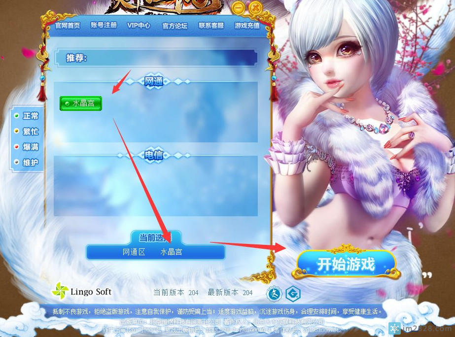 完全正常以后的游戏登录界面,选区以后变成绿色,下面也会有区的显示: